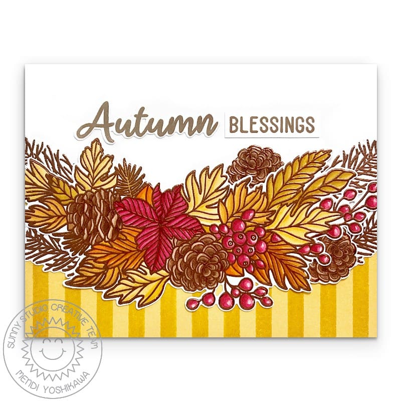 Sunny Studio Gold Embossed Watercolor Leaves, Berries, & Pinecones Fall Blessings Card using Autumn Garland 4x6 Clear Stamps
